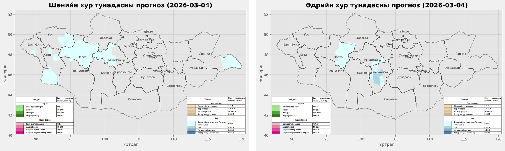 Хур тунадас: Ихэнх нутгаар солигдмол үүлтэй. Шөнөдөө Монгол-Алтай, Хангайн уулархаг нутгаар, өдөртөө Хангай, Хөвсгөлийн уулархаг нутгаар ялимгүй цас орж, явган шуурга шуурна.
