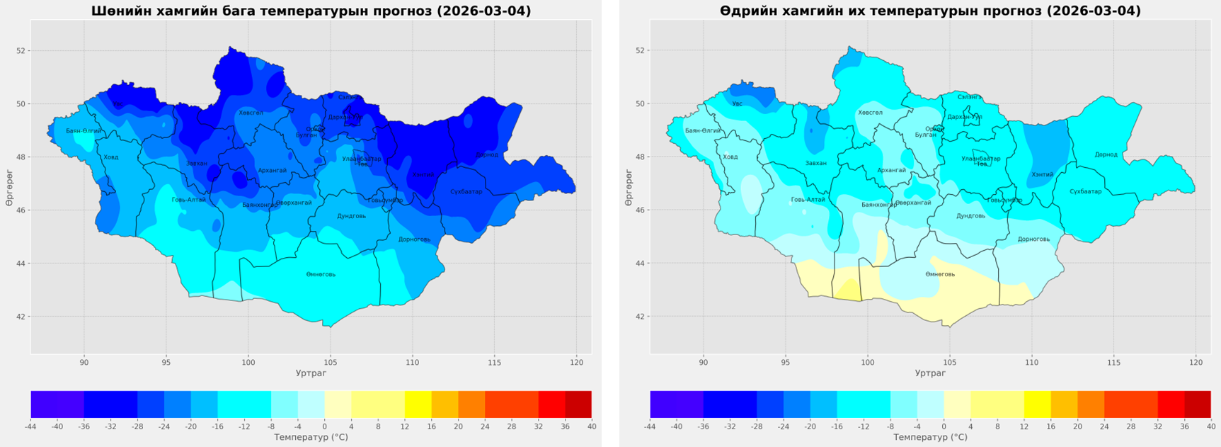 Агаарын температур: Шөнөдөө Тэс голын хөндийгөөр -36...-41 градус, Увс нуур болон Дархадын хотгор, Завхан, Заг-Байдраг голын эхээр -30...-35 градус, Хангай, Хөвсгөл, Хэнтийн уулархаг нутаг, Идэр, Эг, Үүр, Орхон, Сэлэнгэ, Хараа, Ерөө, Туул, Тэрэлж голын хөндийгөөр -25...-30 градус, говийн бүс нутгийн баруун өмнөд хэсгээр -8...-13 градус, Хангайн нурууны өвөр бэл, говийн бүс нутгийн хойд болон зүүн хэсгээр -14...-19 градус, бусад нутгаар -20...-25 градус хүйтэн,