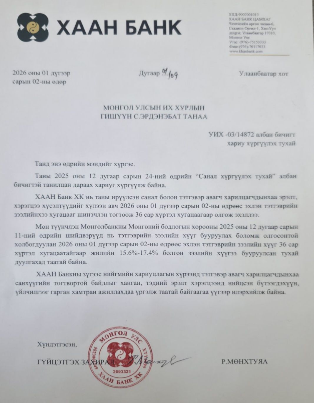 Уг албан бичигт тэтгэврийн зээлийн хүүг бууруулж, зээлийн хугацааг 36 сар болгон сунгахыг хүссэн байна. Албан бичигт хариуг ХААН банкны захирал 2026 оны нэгдүгээр сарын 2-ны өдөр хүргүүлсэн байна.