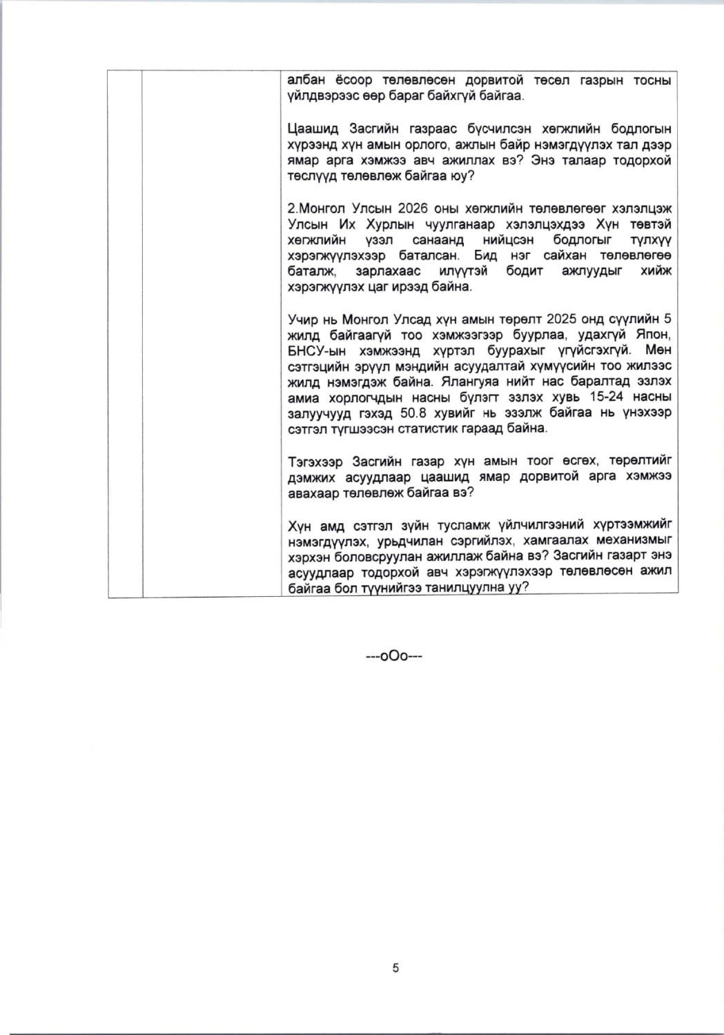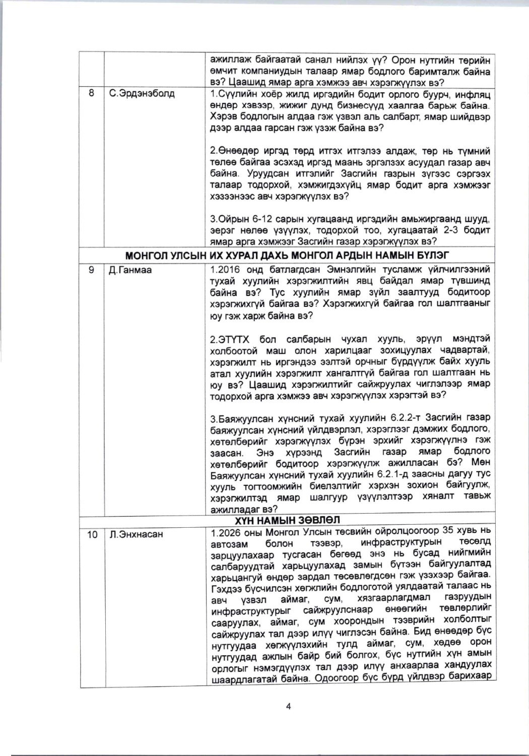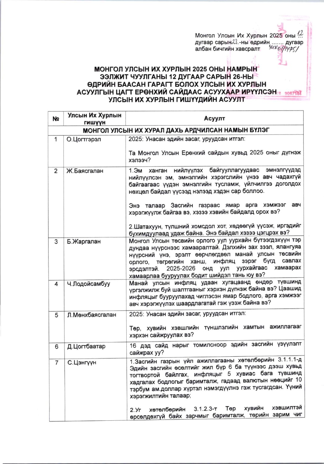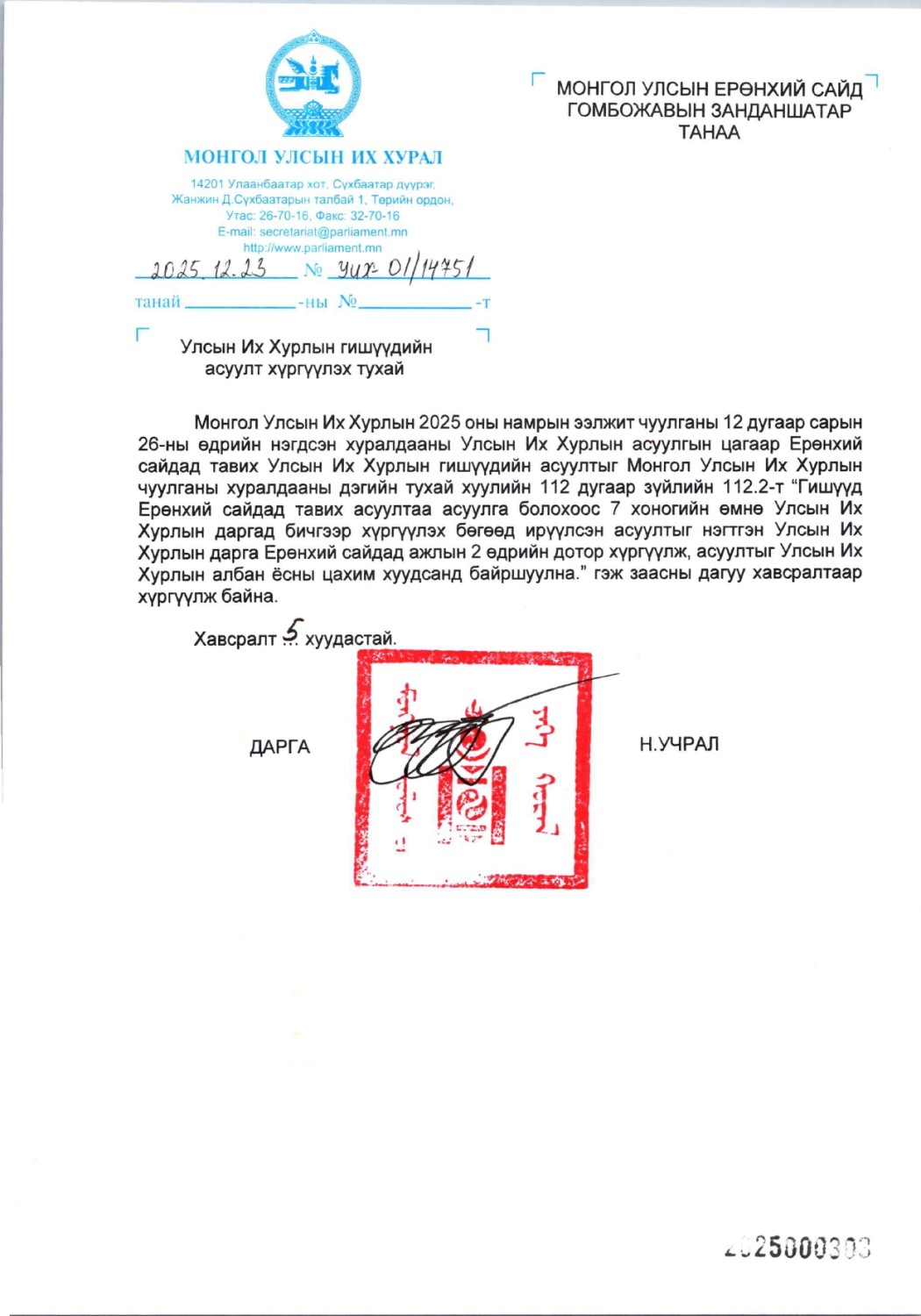 УИХ-ын 12-р сарын 26-ны нэгдсэн хуралдааны УИХ-ын асуулгын цагаар Ерөнхий сайдад тавих УИХ-ын гишүүдийн асуултыг УИХ-ын дарга Н.Учрал өнөөдөр албан бичгээр хүргүүлжээ.