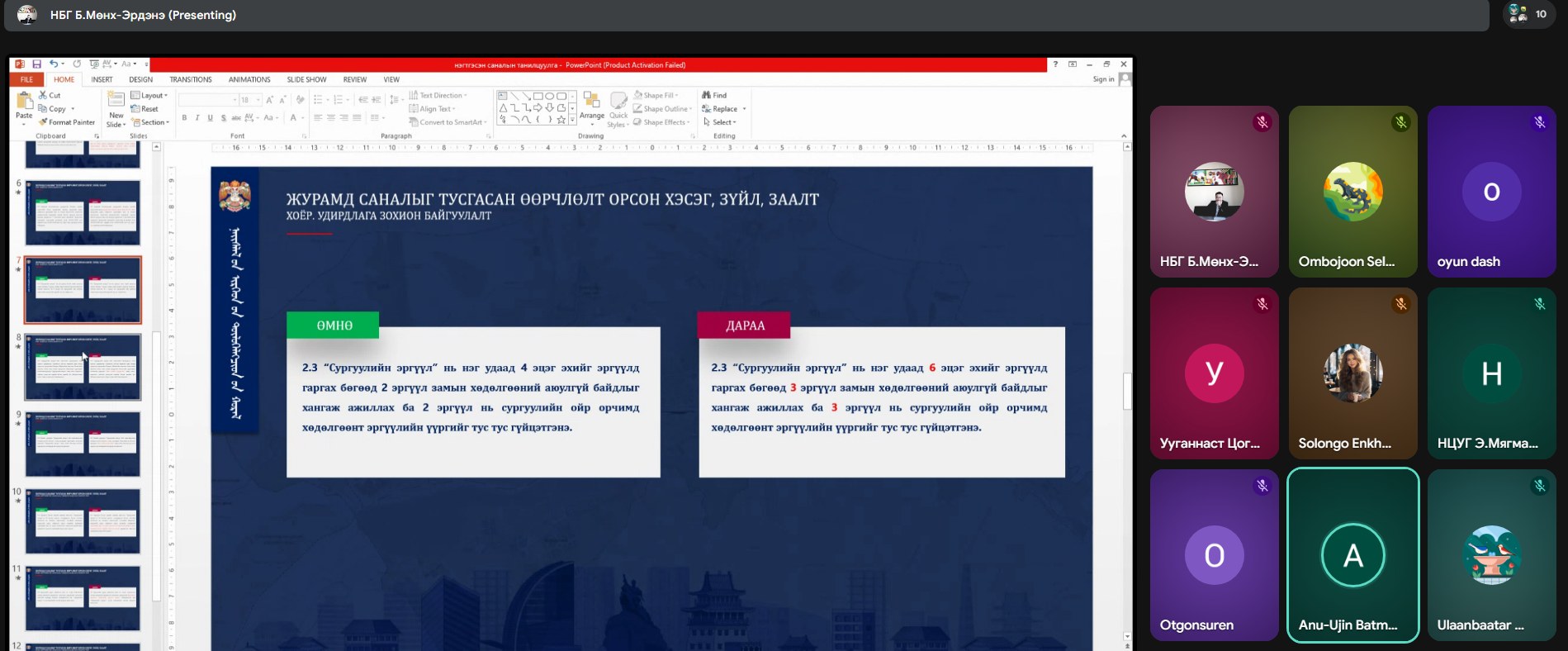 Хуралд НИТХ-ын төлөөлөгч Б.Ану-Үжин, Д.Отгонсүрэн, Нийслэлийн Боловсролын газрын дарга Б.Амартүвшин, ЦЕГ-ын Тээврийн цагдаагийн албаны Урьдчилан сэргийлэх хэлтсийн дарга Д.Оюун, Сурагчдын холбооны дарга О.Сэлэнгэ нар цахимаар оролцож, санал бодлоо илэрхийллээ.