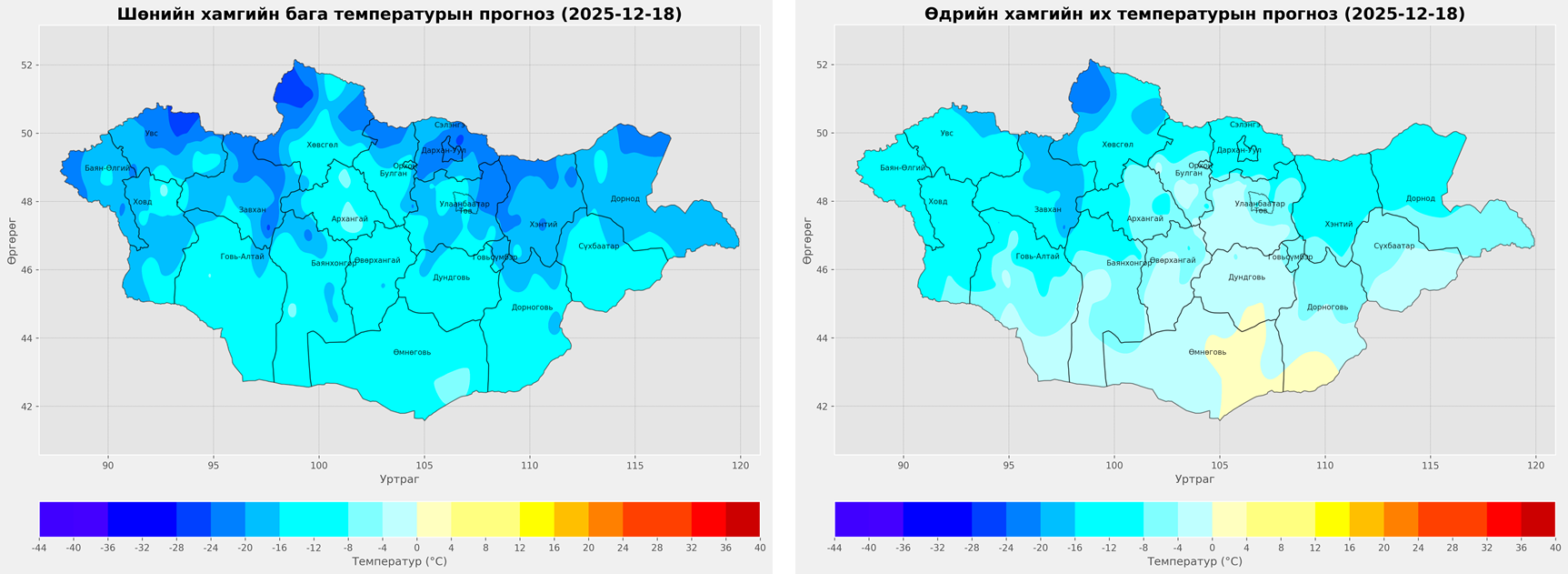 Агаарын температур: Шөнөдөө Увс нуур болон Дархадын хотгор, Хэнтийн уулархаг нутаг, Тэс, Байдраг, Эг, Үүр, Ерөө, Хэрлэн, Онон, Улз, Халх голын хөндийгөөр -22...-27 градус, Монгол-Алтай, Хөвсгөлийн уулархаг нутаг, Завхан голын эх, Хүрэнбэлчир орчим, Идэр, Орхон, Сэлэнгэ, Хараа, Туул, Тэрэлж голын хөндий, Дорнод-Дарьгангын тал нутгаар -18...-23 градус, Говь-Алтайн нуруу, Хангайн нурууны өвөр бэл, говийн бүс нутгийн баруун өмнөд хэсгээр -5...-10 градус, бусад нутгаар -12...-17 градус хүйтэн, өдөртөө баруун болон төвийн аймгуудын нутгаар хүйтэрч Увс нуур болон Дархадын хотгор, Тэс, Байдраг голын хөндийгөөр -17...-22 градус, Монгол-Алтай, Хангай, Хөвсгөлийн уулархаг нутаг, Завхан голын эх, Идэр, Эг, Үүр, Сэлэнгэ, Ерөө, Хараа, Онон, Улз голын хөндийгөөр -11...-16 градус хүйтэн, говийн бүс нутгийн өмнөд хэсгээр 0...+5 градус дулаан, говийн бүс нутгийн хойд хэсгээр 0...-5 градус, бусад нутгаар -6...-11 градус хүйтэн байна.