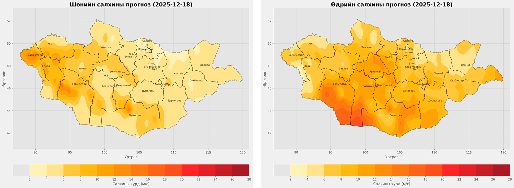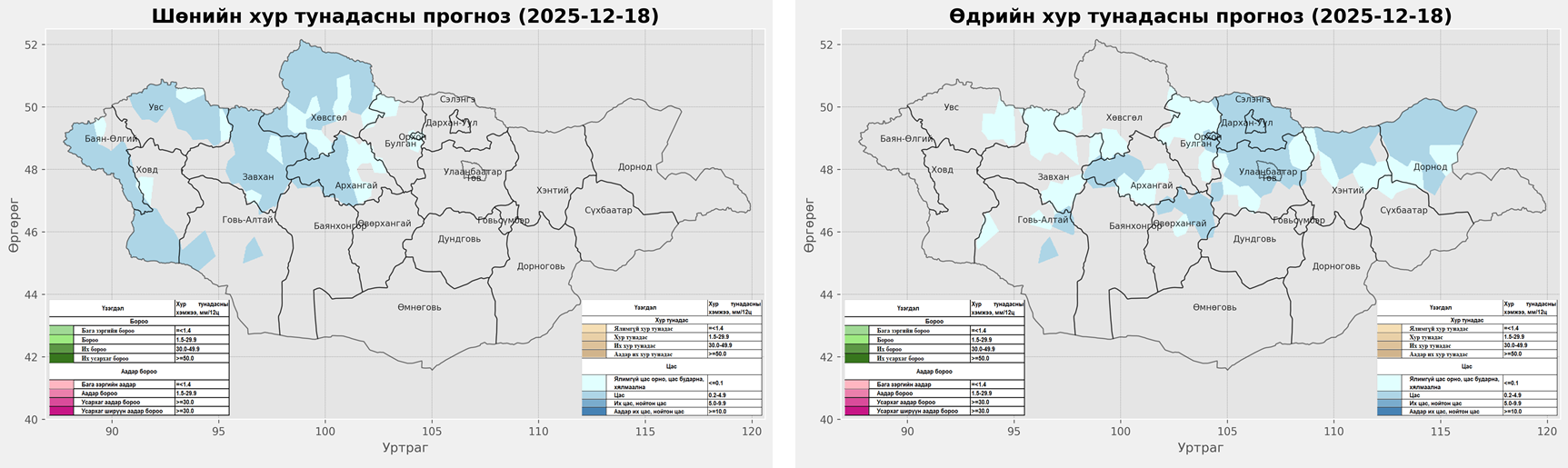 18-нд баруун аймгуудын нутгийн хойд хэсэг, төвийн аймгуудын ихэнх нутгаар, 19-нд төвийн аймгуудын нутгийн зүүн хэсэг, зүүн аймгуудын нутгаар цас орж, цасан шуурга шуурч, ихэнх нутгаар хүйтний эрч чангарч, нутгийн өмнөд хэсгээр салхи шуургатай байх тул зам даваа гүвээнд халтиргаа гулгаа ихсэж, үзэгдэх орчин хязгаарлагдахыг анхааруулж байна.