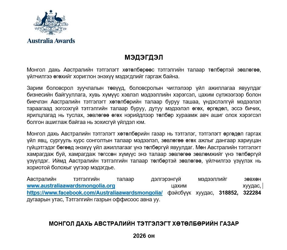 МЭДЭГДЭЛ: Австралийн тэтгэлэгт хөтөлбөрийн талаар төлбөртэй үйлчилгээ үзүүлэхийг хориглов