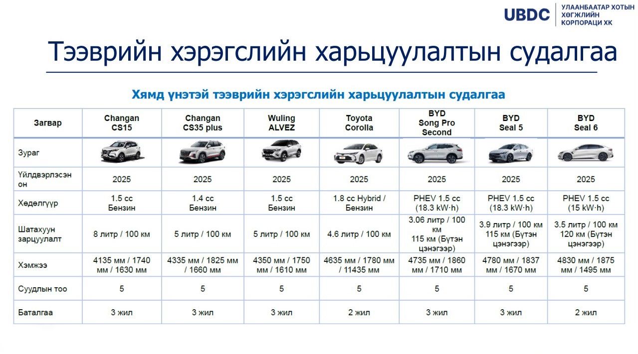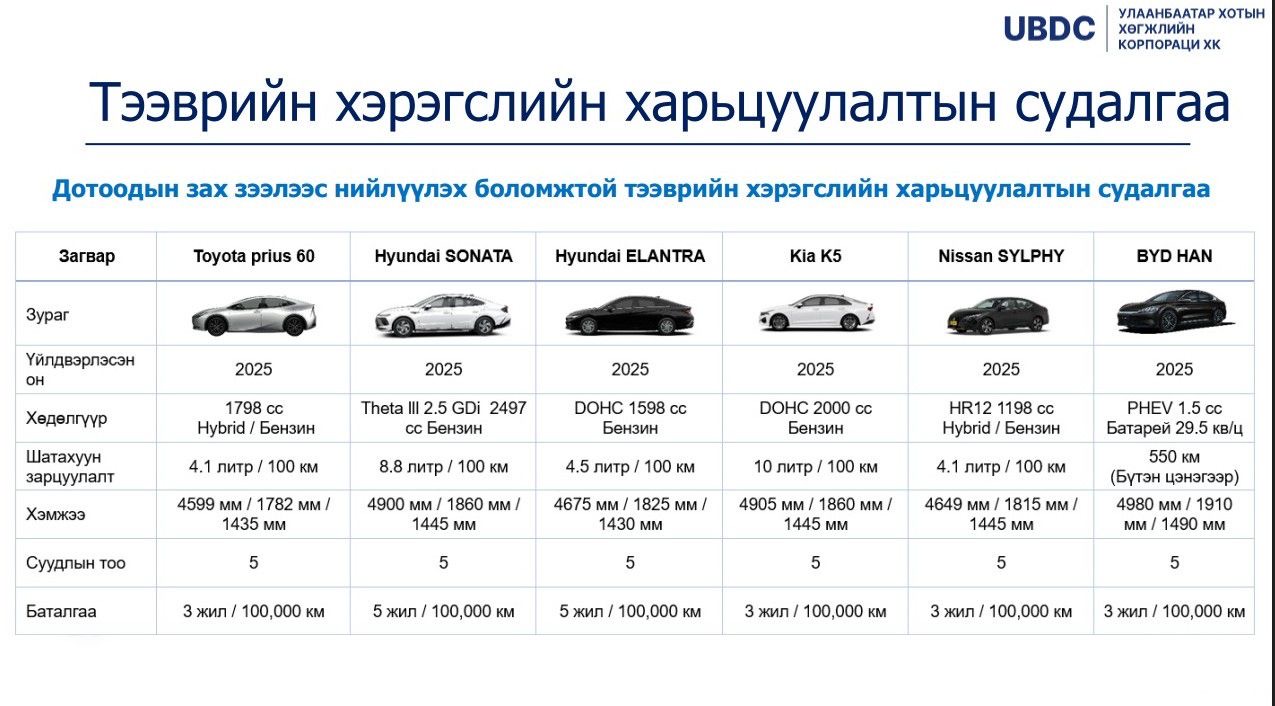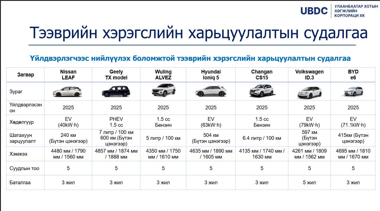 НЗДТГ-ын Хэвлэл мэдээлэл, олон нийттэй харилцах хэлтсээс тодруулахад “Зөвхөн хятад машин оруулж ирнэ гэдэг нь худал мэдээлэл. Такси үйлчилгээг сайжруулах төслийн ТЭЗҮ-д дэлхийн хотуудад такси үйлчилгээнд явж байгаа зорчигчид тухтай, байгаль орчинд ээлтэй 10 үйлдвэрийн төрөл бүрийн маркийн автомашинуудыг судалсан. Дараах 3 төрлөөр судалгаа хийсэн. Дотоодын зах зээлээс нийлүүлэх боломжтой тээврийн хэрэгсэл, үйлдвэрлэгчээс нийлүүлэх боломжтой тээврийн хэрэгсэл, хямд үнэтэй тээврийн хэрэгсэл гэсэн жагсаалтууд гарсан. Үүнд, Toyota, Hyundai, Kia, Nissan, Geely, Wuling, Changan, Volkswagen зэрэг дэлхийд тэргүүлэгч, байгальд ээлтэй, зорчиход тухтай үйлдвэрүүдийн машинаас хувийн хэвшлийн аж ахуйн нэгж өөрсдөө сонгож авах боломжтой” гэв.
